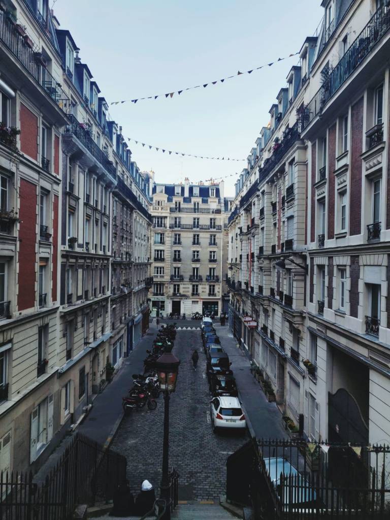 I hear words where there are none, and footsteps resonate in absolute silence. I feel the warmth of another beside me. Down by Rue des Saules, I take a right only to end up in one of those sections of Paris which seem to be a world of its own. Two large dusted buildings appear dull against strings of chromatic triangular flags hanging from its body—blue, yellow and white, fluttering now and again with the inescapable Paris wind. There is no sun. Puddles of water reflect the grey of the sky above, misted by reflections of window panes, and damp-flood lights. Three guys and a girl, with baggy sweatshirts and ripped jeans, accompanied by thuds of French rap music, are sitting in the corners of this flat-square world. The guy with blond hair in a blue sweatshirt, with the face of a boy and the body of a man, dribbles a football, while the others continue their conversation. The guys talk while the girl smokes her cigarette. Holding it between the crevices of her bony fingers, she breathes a song in my head. We are walking.
