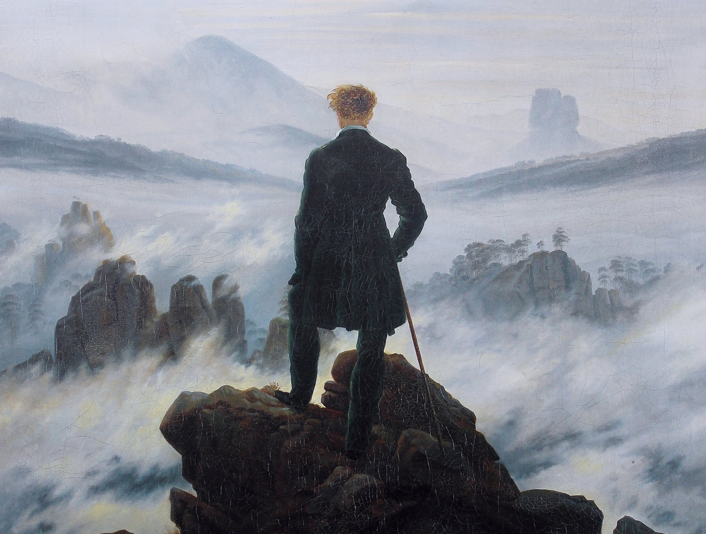 Un tableau réalisé par Friedrich en 1818 représente un voyageur, de dos, au sommet d’une montagne, surplombant une mer de nuages. Cette œuvre est devenue une icône du romantisme. De ce personnage, nous ne saurons rien, ni ses traits ni ses desseins. Il est suspendu pour l’éternité entre l’absolu et la finitude. Le ciel et l’abîme l’englobent, il devient le point focal du tableau qui concentre la grandeur tout autant que la solitude. Le voyage de la vie s’arrête au bord du gouffre. La ligne d’horizon et les crêtes ne sont qu’un lointain écho des montagnes bien réelles de l’Elbe, de même que la Mer de glace qui broie un navire dans Le naufrage est moins un rappel géographique qu’une poignante métaphore. Emu par cette toile, en 1834, David d’Angers évoquera à son propos la tragédie du paysage. Laissons donc Lamartine conclure : « Borné dans sa nature, infini dans ses vœux / L’homme est un dieu tombé qui se souvient des cieux. »