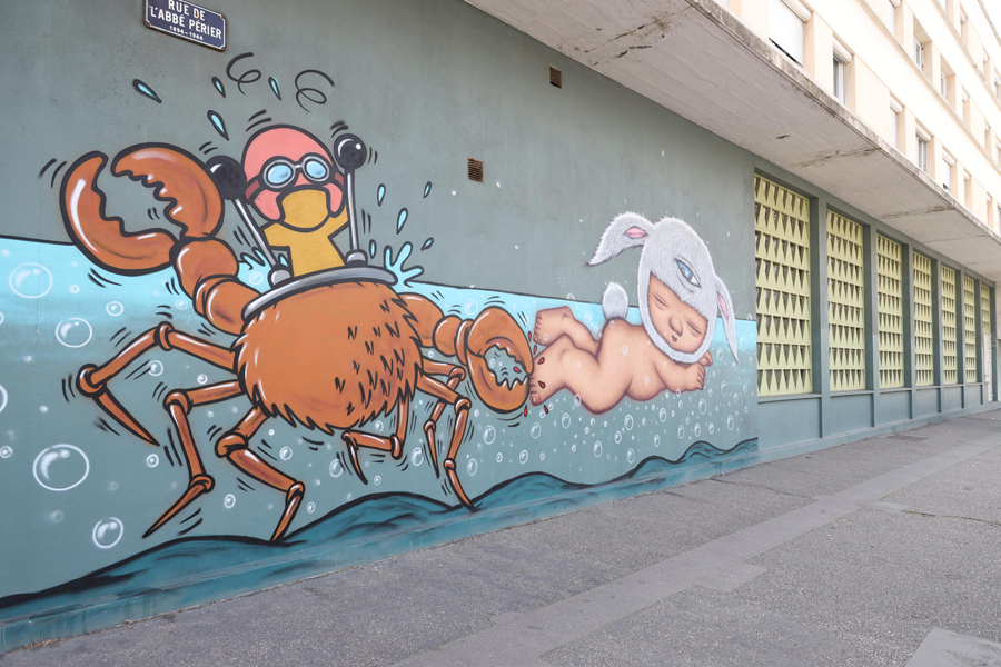 On the occasion of the celebration of Le Havre’s 500th anniversary in 2017, Jace, a Le Havre-borned street artist called on Thai artist Alex Face to create this collaborative work. The piquant meeting of two emblematic characters of street art, the gouzou and the famous childish character in the costume of rabbit and the third eye.