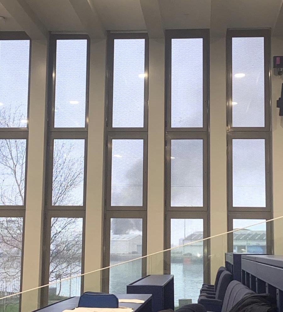 Smoke caused by industrial actions at the docks in Le Havre, as observed from Sciences Po Le Havre’s Grand Amphitheater. Taken November 2024.
